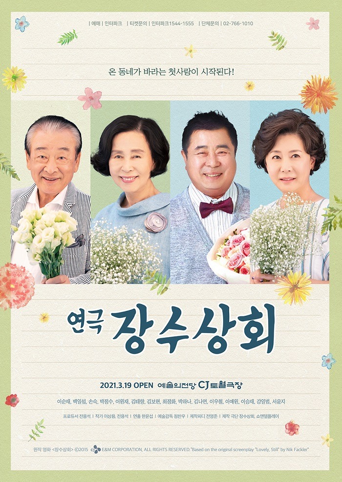 장수상회의 오랜 모범 직원이자 연애에는 숙맥인 까칠한 노신사 김성칠 역의 이순재와 소녀처럼 수줍지만 사랑에는 당찬 꽃집 사장님 금님 역의 손숙, 박정수를 다시 한번 무대에서 만나볼 수 있다. 더불어 2016년 초연 이후 오랜만에 백일섭이 다시 한번 김성칠 역으로 무대에 오른다는 반가운 소식이다.