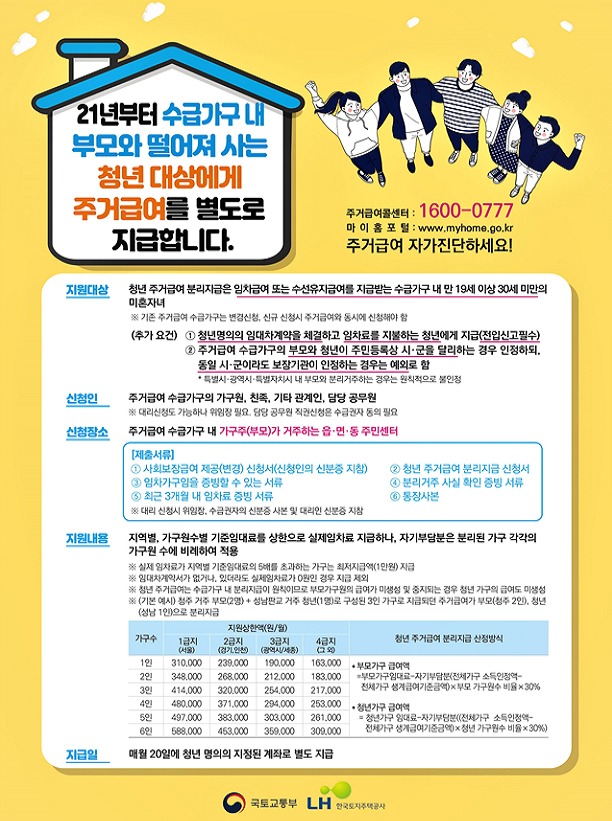 청년 주거급여 분리지급은 주거급여 수급가구의 20대 미혼 자녀가 학업이나 구직 등을 이유로 부모와 따로 사는 경우 부모에게 지급되는 주거급여와는 별도로 자녀에게 주거급여를 지급하는 제도로 올 1월부터 시행됐다.