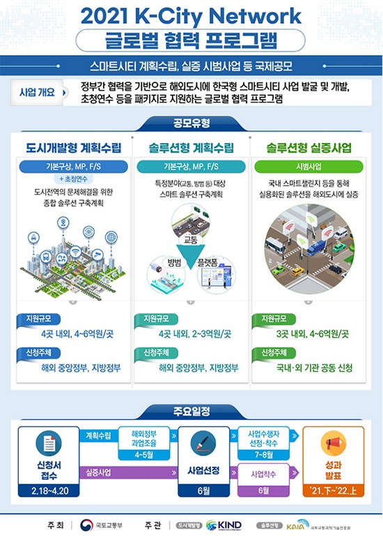 올해 ‘K-City 네트워크’ 사업은 18일 공고 이후 4월 20일까지 접수해 6월 말 선정된다. 사업은 과업 범위, 난이도, 코로나19 여건 등을 고려해 내년 상반기까지 수행할 예정이다.