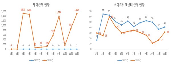 다만 재택근무가 증가함에 따라 스마트워크센터 근무는 지난해 372명으로 34.2% 감소했고 사무실 유연근무(시차출퇴근제) 도 2019년 2만 8084명에서 지난해 2만 3682명으로 15.7% 감소했다.