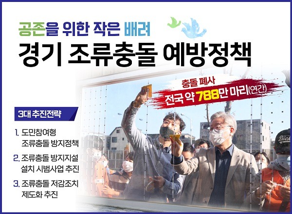 도는 야생 조류 충돌사고 예방을 위해 지난해 11월부터 4개 실‧국 10개 팀이 참여하는 전담조직(T/F)을 구성했으며 ‘작은 배려로 사람과 동물이 공존 가능한 경기도’라는 비전 아래 ‘3대 추진전략’을 수립했다.