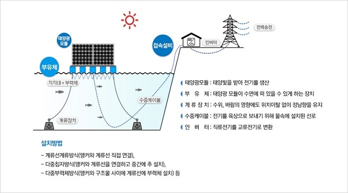 수상 태양광 발전소는 육상 태양광 기술과 부유식 구조물 기술을 융합한 것으로 물에 뜨는 구조물 위에 태양광 발전소를 건설하는 형태이다. 수상 태양광은 유휴부지인 수면을 이용해 국토를 효율적으로 활용할 수 있고, 육상태양광에 비해 그림자 영향이 적고 모듈의 냉각효과가 있어 발전량이 10% 높게 나오는 장점이 있다.