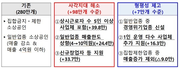 이 중 소상공인 버팀목자금 플러스+ 지원대상을 기존 버팀목자금(280만개) 보다 약 105만개 늘린 385만개로 확대했다. 근로자 5인 이상 포함(+40만), 일반업종 매출한도(4억→10억원) 상향(+24만), 1인 다수사업체 추가지원(+16만) 등으로 사각지대를 해소한다.