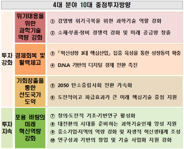 세부적으로는 우선 위기대응을 위한 과학기술 역량 강화를 위해 감염병 위기극복과 소재·부품·장비 경쟁력 강화를 중점 지원한다.