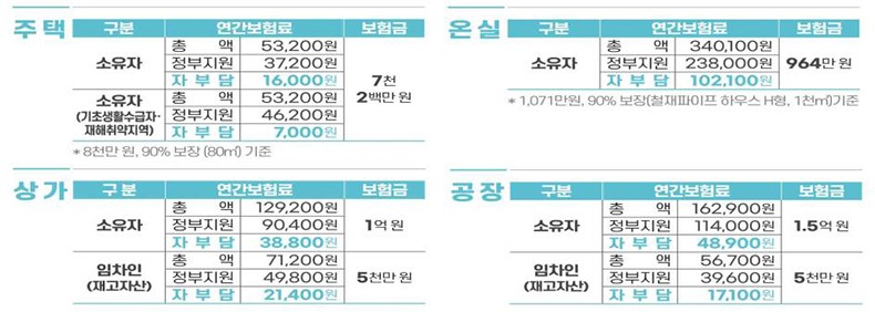 가령 보험상품별 보험가입자가 부담하는 연간보험료는 주택(80㎡, 90%보장형 기준)은 1만 6000원, 온실(1천㎡, 90%보장형 기준) 10만 2000원, 상가(보상한도 1억 기준) 3만 8000원 수준이다.