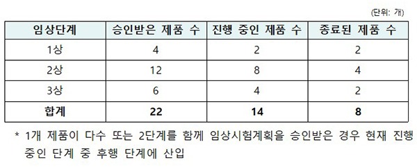 이에 따라 현재 국내에서 코로나19 치료제로 임상시험계획을 승인받은 제품은 총 22개(20개 성분)이다. 이중 임상시험 진행 중인 제품은 14개(13개 성분)이며 종료된 제품은 8개다.