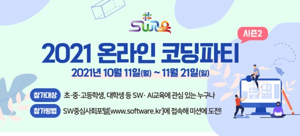과학기술정보통신부와 교육부, 한국과학창의재단은 쉽고 재미있게 소프트웨어와 인공지능 교육을 체험할 수 있는 ‘2021 온라인 코딩파티 시즌2’를 오는 11일부터 21일까지 개최한다고 밝혔다.
