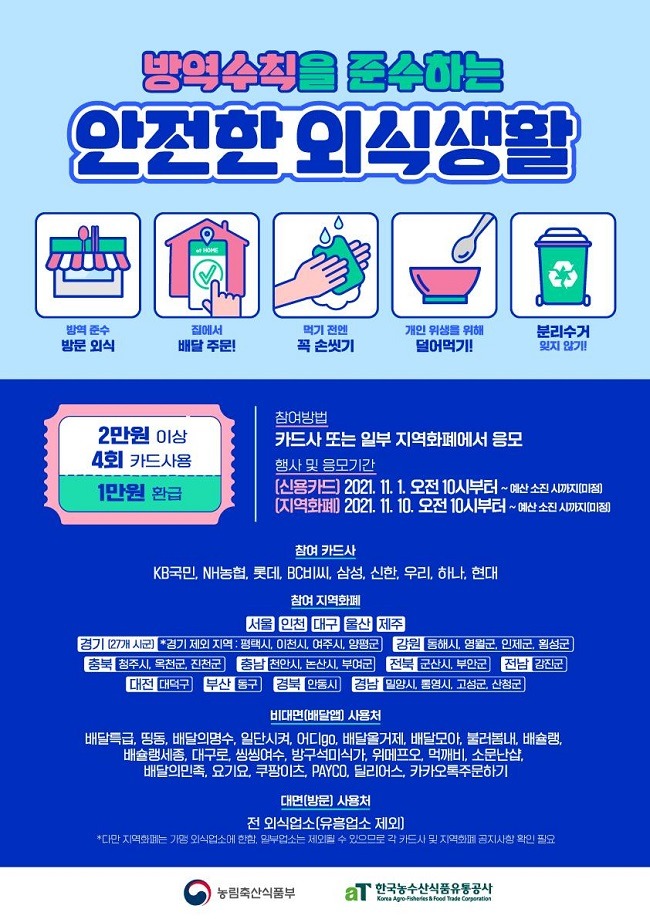 농림축산식품부(이하 “농식품부”)는 단계적 일상회복 전환 시점에 맞춰 엄중한 코로나19 상황에 따라 비대면으로 진행해왔던 외식 할인 지원사업과 전년 11월 이후 중단된 농촌관광 할인 지원사업을 11월 1일(월)부터 재개한다고 밝혔다.