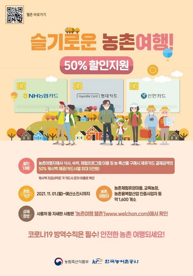 11월 1일부터 “코로나 백신 맞고 힐링여행 가자”, “웰촌 여행후기 공모전”, “웰촌 소·일·행” 등 홍보 이벤트를 개최하고, 코로나19로부터 안전하고 깨끗한 가을·겨울에 가볼만한 농촌체험휴양마을 20선을 선정하여 소개한다고 밝혔다.