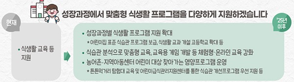 어린이에게는 영양가 있는 맞춤형 급식 제공을 지원, 성장에 필요한 영양소를 고려한 균형 잡힌 학교급식을 제공하고 비만 등 건강취약 어린이를 위한 맞춤형 식단을 개발·보급하며 알레르기 식단관리도 강화한다.