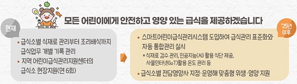이에 식재료 구매부터 배식까지 급식관리 절차 전반에 ‘스마트 어린이 급식관리 시스템’을 2024년부터 적용하고, 지역센터별로 특화된 전문센터와 급식소별 전담영양사 지정 제도를 도입해 체계적으로 지원한다.