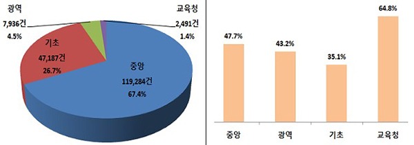 이어 기초지자체가 4만 7187건으로 26.7%, 광역지자체가 7936건 4.5%였으며 교육청은 2491건 1.4%로 가장 적었다.