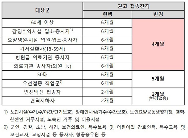 요양병원, 의료기관 등 자체적으로 접종을 시행하는 기관은 오늘(17일)부터 바로 4개월의 단축 기간을 적용해 접종을 실시할 계획이며, 보건소의 방문 접종팀 등의 방문접종이 필요한 감염취약시설은 일정을 조정해 접종을 신속하게 진행할 계획이다.