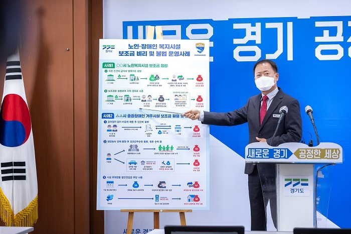 김영수 경기도 공정특별사법경찰단장은 24일 경기도청에서 기자회견을 열고 지난 4월부터 11월까지 도내 사회복지시설을 중심으로 진행한 ‘노인·장애인 복지시설 보조금 비리 및 불법 운영’ 기획 수사 결과를 발표했다.