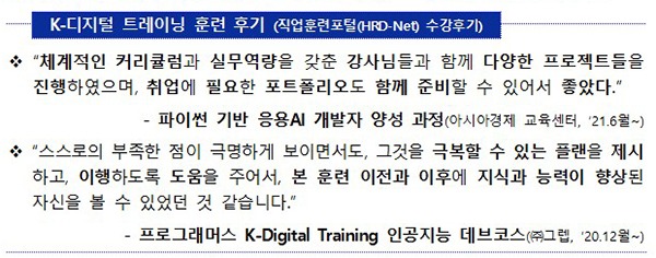 무엇보다 직업훈련포털(HRD-Net)을 통해 디지털·신기술 분야 훈련에 참여한 훈련생 및 수료생들은 대체로 만족스러운 반응을 보인것으로 나타났다.