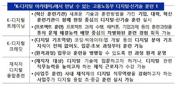 이번에 신설한 K-디지털 아카데미에서는 ▲디지털·신기술 분야 직업훈련 소개와 훈련과정 검색·신청 ▲디지털·신기술 분야 직업과 산업 전망 소개 ▲디지털·신기술 분야 채용정보 안내 서비스 등을 만날 수 있다.