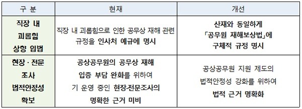 이는 기존의 하위 법령인 ‘공무상 질병 판정기준’(인사처 예규)을 통해 보상하던 직장 내 괴롭힘과 민원인의 폭언 등에 대한 재해를 ‘공무원 재해보상법’으로 상향 입법하기 위한 조치다.