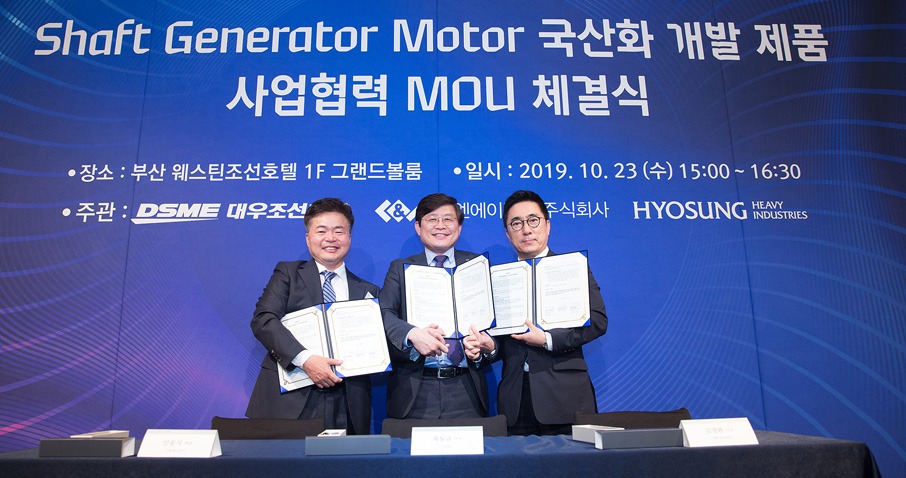 대우조선해양은 축발전기모터시스템 국산화 개발을 완료하고 공동개발 파트너사인 시엔에이전기 및 효성중공업과 사업화에 대한 양해각서 서명식을 가졌다고 24일 밝혔다.