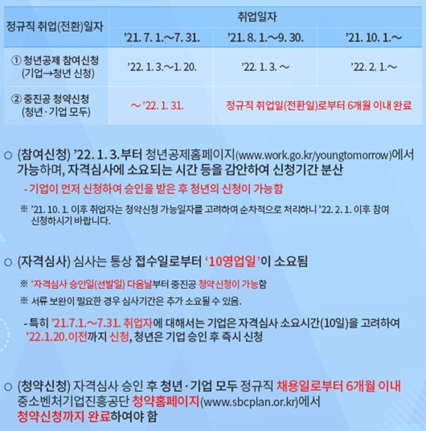 또한 기업 귀책 사유로 중도해지된 경우도 재가입 요건을 완화, 코로나19 상황 등으로 취업 기회가 부족하다는 현장 의견을 고려해 중도해지 청년의 더욱 원활한 노동시장 복귀를 지원하기 위해 퇴사 후 1년 이내 재취업하면 가능하도록 변경했다.
