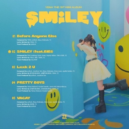 타이틀곡 'SMILEY'는 최예나하면 빼놓을 수 없는 특유의 행복 에너지가 담겨 있는 곡이다. 긍정 마인드가 잘 담겨 있는 가사와 밝은 멜로디는 최예나만의 매력을 극대화했다. 이와 함께 절친 비비가 피처링 지원사격에 나서 한층 더 특별함을 더했다.
