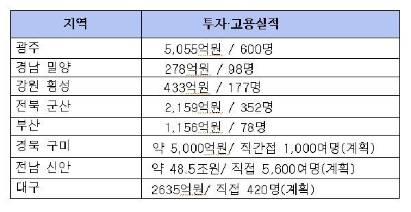 지난해 12월 8일 일자리위원회와 산업통상자원부 등이 함께 주최한 2021 상생형 지역일자리 포럼에 따르면 최근 상생형 지역일자리로 추가된 구미를 제외한 광주, 밀양, 횡성, 군산, 부산 등 5개 지역에서 약 9081억원의 투자와 1300개의 직접 일자리를 창출한 것으로 나타났다.