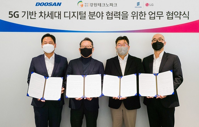 두산중공업은 강원테크노파크(이하 강원TP), 에릭슨엘지, ㈜두산 디지털이노베이션(이하 DDI)과 ‘5G 기반 차세대 디지털 분야 협력을 위한 업무 협약’을 체결했다고 10일 밝혔다. 경기도 분당두산타워에서 열린 협약식에는 강원TP 김성인 원장, 에릭슨엘지 심교헌 상무, DDI 임인영 전무, 두산중공업 장세영 상무 등 각 사 관계자들이 참석했다.