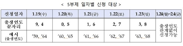 예를 들어, 신청 첫날인 19일은 출생연도 끝자리가 9 또는 4, 20일에는 0 또는 5인 경우 신청할 수 있으며, 24일부터 다음 달 4일까지는 출생연도 끝자리와 관계없이 신청할 수 있다. 26일까지 신청하면 설 연휴 전인 28일까지 지급받을 수 있다.