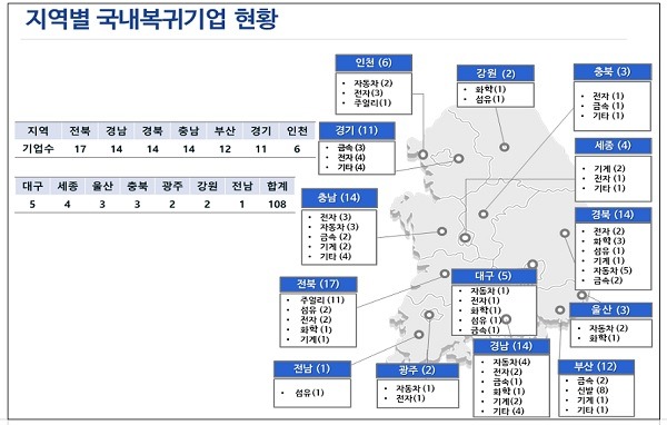 관련 통계를 공식 집계한 2014년 이후 누적 국내복귀기업 수는 총 108개다.