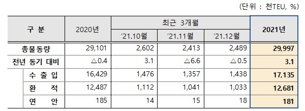 특히 컨테이너 물동량은 지난해 세계 주요 항만들의 컨테이너 물류 적체 현상에도 전년 대비 3.1% 증가한 3000만 TEU를 기록, 이는 코로나19 위기 이전인 2019년 보다 2.6% 증가한 것으로 나타났다. 이때 TEU는 표준 컨테이너 크기를 나타내는 단위로, 20ft 컨테이너 하나를 1TEU라고 하며 40ft 컨테이너 하나는 2TEU로 계산한다.