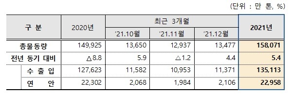 또 지난해 12월 항만물동량은 총 1억 3477만 톤으로 전년 동월 대비 4.4% 늘었고, 그 중 수출입 물동량은 1억 1371만 톤으로 전년 동월 대비 4.1% 증가했다. 물동량 기준에서 항만별로 살펴보면 부산항·광양항·인천항이 전년 대비 각각 7.6%·6.9%·3.8% 증가하는 등 대부분의 항만이 늘었으나, 울산항은 1.7% 감소했다.