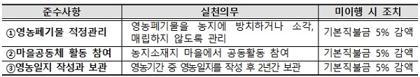 다만 ▲영농폐기물 적정 처리 ▲마을공동체 활동 참여 ▲영농일지 작성 준수사항은 현장 여건을 고려해 2년의 계도기간을 거쳐 올해부터 본격 시행된다.