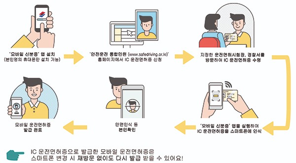또한 스마트폰을 교체했거나 분실한 경우에도 운전면허시험장이나 경찰서 재방문없이 IC 운전면허증으로 모바일 운전면허증을 다시 발급받으면 된다.