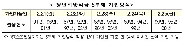 이날부터 오는 25일까지는 5부제 가입방식이 적용된다. 21일은 1991년, 1996년, 2001년생, 22일은 1987년, 1992년, 1997년, 2002년생, 23일은 1988년, 1993년, 1998년, 2003년생, 24일은 1989년, 1994년, 1999년생, 25일은 1990년, 1995년, 2000년생이 가입할 수 있다. 1987년 2월 22일생까지는 5부제 가입방식 적용 없이 가입일 기준 만 34세 이하인 날에 가입할 수 있다.
