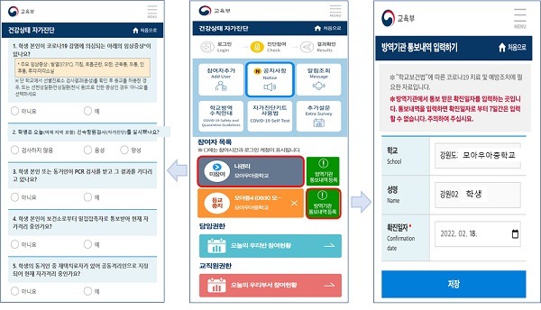 개선된 자가진단 앱에는 학생·교사가 신속항원검사를 실시할 경우 그 결과를 입력하는 문항이 추가됐으며, 기존 4개의 진단 문항을 현 시점에 맞게 조정된다.