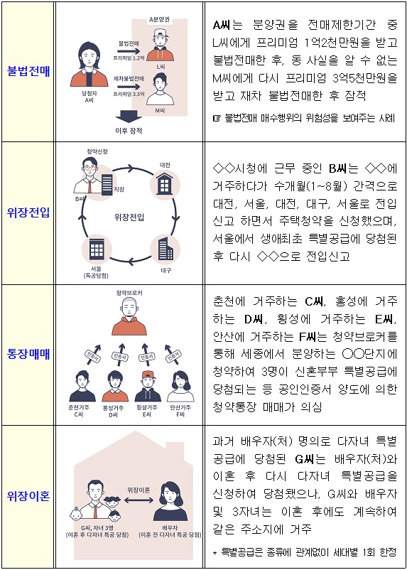 또 위장이혼으로 재차 특별공급을 받거나 청약점수(공공분양 신혼특공)를 높이기 위해 허위로 이혼하는 방식의 부정청약 9건과 불법전매로 전매제한 기간 중 이면계약을 체결(매매대금 수수)한 뒤 전매제한 기간이 끝나면 시행사와 분양권 권리의무승계를 처리하는 방식의 불법전매 2건 등도 적발됐다.