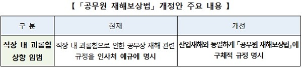 그간 인사처 예규에 명시된 행정규칙인 ‘공무상 질병 판정기준’을 통해 직장 내 괴롭힘으로 인한 공무상 재해를 보상해왔으나 이번 개정안에 따라 앞으로는 공무원의 공무로 인한 부상·질병·사망 등에 대해 적합한 보상·지원을 담은 ‘공무원 재해보상법’에 근거해 공무상 재해를 보상한다.