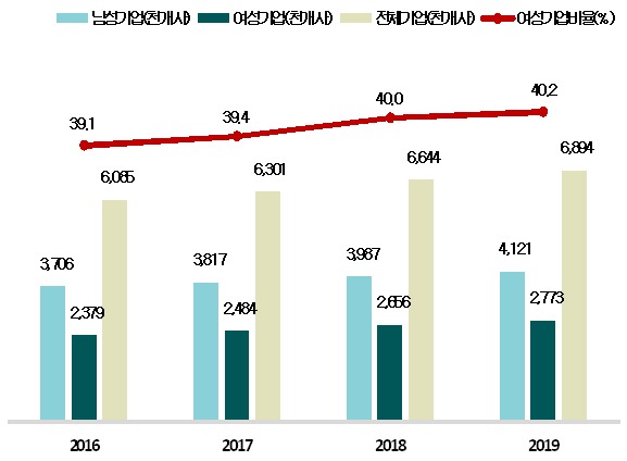 2019년 여성기업은 전체기업의 40.2%, 277만개로 2018년 대비 4.4% 늘어 역대 최대 수준을 기록했다.