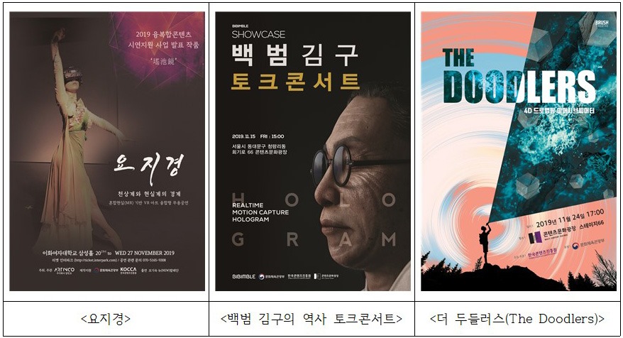 한국콘텐츠진흥원(이하 콘진원)은 오는 11월 8일(금)부터 11월 24일(일)까지 서울 동대문구 홍릉에 위치한 융복합 콘텐츠 시연무대인 콘텐츠문화광장에서 ‘2019 융복합 콘텐츠 시연지원’사업 선정 3개 작품을 선보인다.