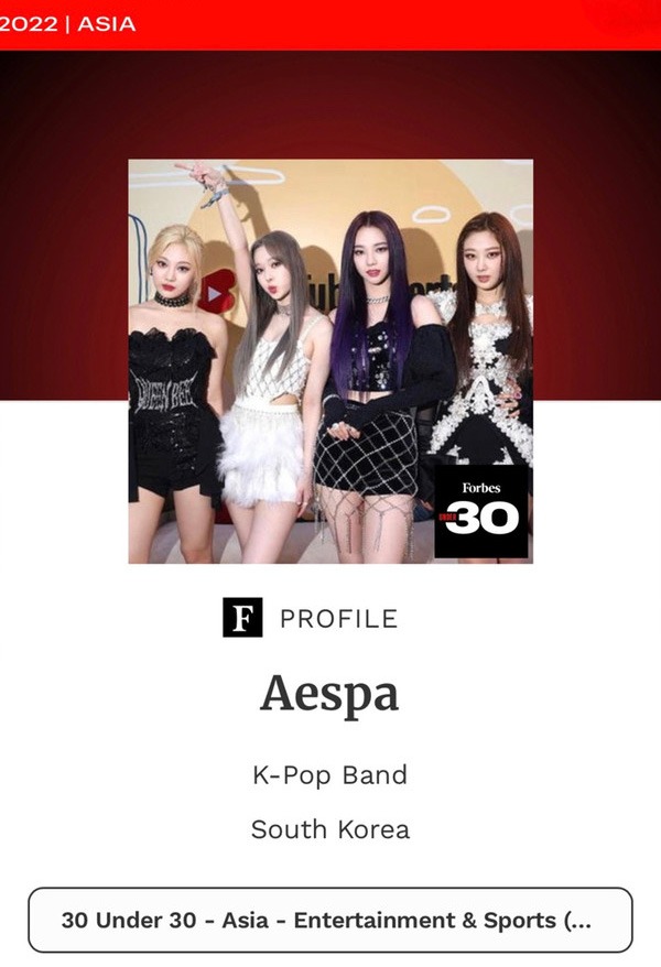 포브스는 매년 아시아 태평양 지역 22개 국가를 대상으로 예술·마케팅·기술·금융·유통·헬스케어 등 10개 분야 30세 이하의 리더들을 선정해 발표하고 있으며, 에스파는 엔터테인먼트&스포츠 부문에 이름을 올렸다.