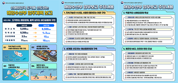 미래 유망분야인 해양신산업을 집중 육성하는 한편, 해양보호구역 면적을 우리 영해의 17%까지 단계적으로 확대하는 등 해양생태계와 사람이 공존할 수 있는 체계도 구축하기로 했다.