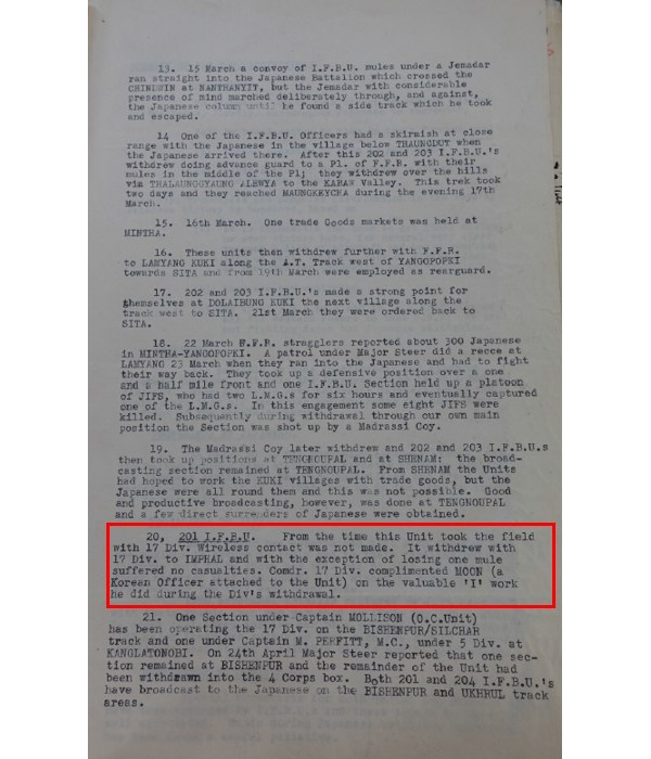 한국광복군 인면전구공작대는 영국특수작전집행부(SOE) 산하의 인도전구선전대(IFBU)에 소속돼 활동한 것으로 기록돼 있다. 또한 인도전구선전대(IFBU) 201부대와 204부대가 비센푸르와 우크룰 지구에서 활동했던 작전지역도 구체적으로 명시돼 있다.