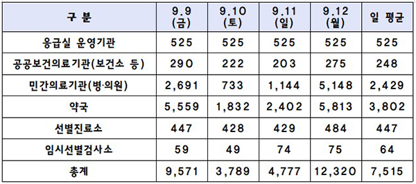 한편 복지부와 지방자치단체는 추석 연휴 동안 응급진료 상황실을 운영하며 문 여는 병·의원, 약국, 선별진료소 및 임시선별검사소의 운영상황을 점검한다.