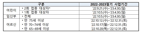 15일 질병관리청이 발표한 2022-2023절기 인플루엔자 대응계획에 따르면 무료 예방접종 대상자는 생후 6개월∼만 13세 어린이와 임신부, 만 65세 이상 어르신이다.