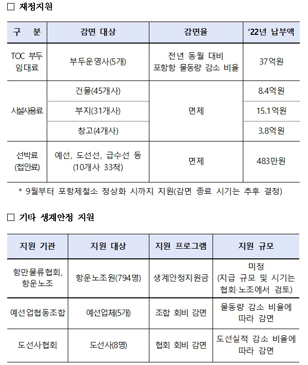 5개 부두 운영사, 포항신항 해운센터 입주기업, 예도선 업체와 항만근로자들이 혜택을 받게 된다.