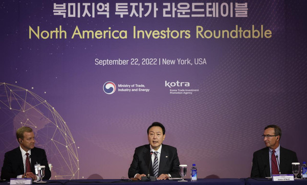 산업부는 윤 대통령이 유엔 총회 참석차 미국을 공식 방문한 가운데 22일 오전(현지시간) 뉴욕에서 ‘북미지역 투자신고식 및 투자가 라운드테이블’을 개최했다.