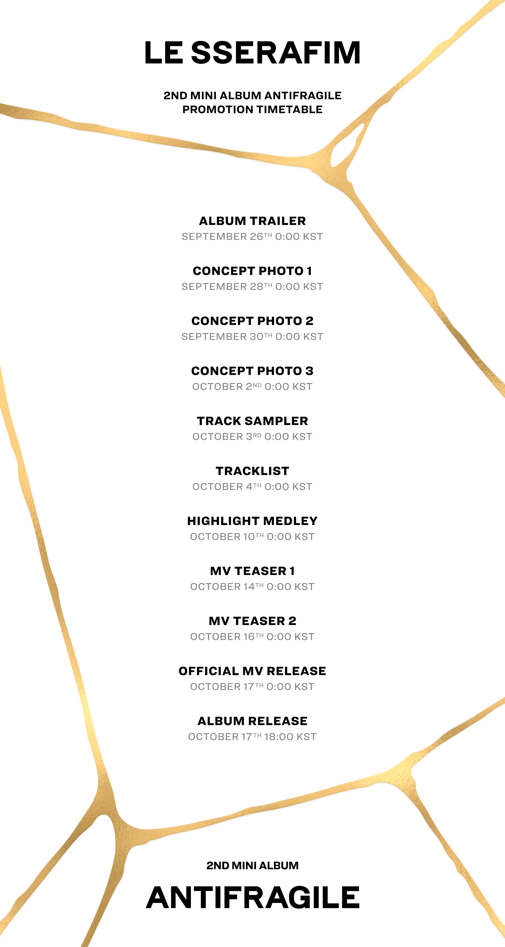르세라핌(김채원, 사쿠라, 허윤진, 카즈하, 홍은채)은 오늘(22일) 0시 쏘스뮤직 공식 SNS에 두 번째 미니 앨범 ‘ANTIFRAGILE’(안티프래자일)의 프로모션 타임테이블을 공개했다.