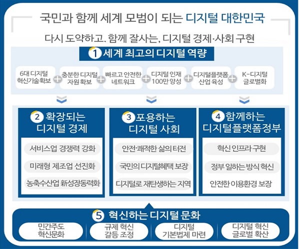 정부는 ‘국민과 함께 세계의 모범이 되는 디지털 대한민국’을 비전으로 ▲세계 최고의 디지털 역량 강화 ▲확장되는 디지털 경제 ▲포용하는 디지털사회 ▲함께하는 디지털플랫폼 정부 ▲혁신하는 디지털 문화 등 5대 추진전략, 19개 세부과제를 추진할 계획이다.