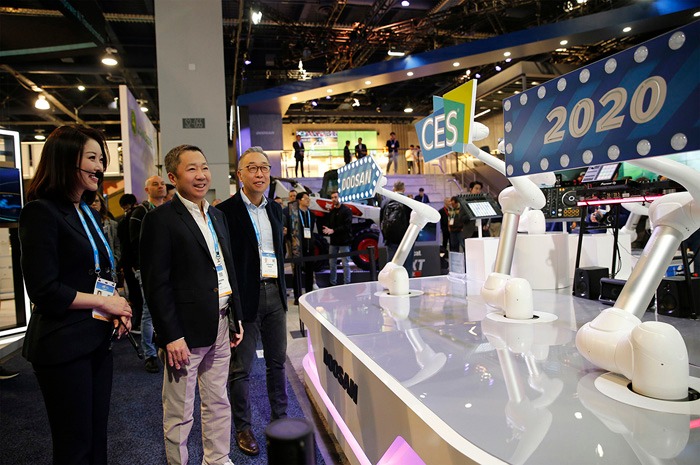 박정원 두산그룹 회장이 8일(현지시간) 박지원 그룹부회장을 비롯한 경영진과 함께 미국 라스베이거스에서 열리고 있는 CES 2020 현장을 찾았다.