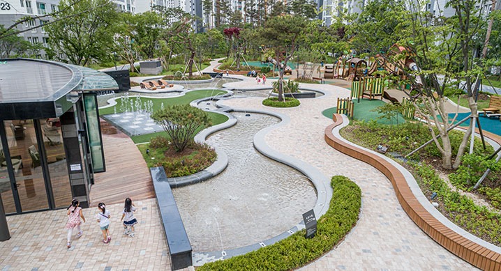 아파트 단지 내에 축구장 규모의 대형 중심마당을 조성하고 미술장식품과 조형성이 강화된 시설물을 설치하여 경관을 예술적으로 연출했다는 평가다. 쾌적하게 열린 잔디광장 주변으로 생태 계류 및 고급 휴게공간을 배치하여 입주민의 이용 편의를 높였다는 점도 두드러졌다.