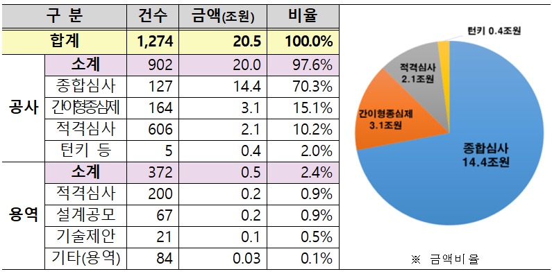 주요 발주유형은 공사부문에서 △종합심사 127건(14조 4천억원) △간이형종심제 164건(3조 1천억원) △적격심사 606건(2조 1천억원), 용역부문에서 △적격심사 200건(2천억원) △설계공모 67건(2천억원)이다.